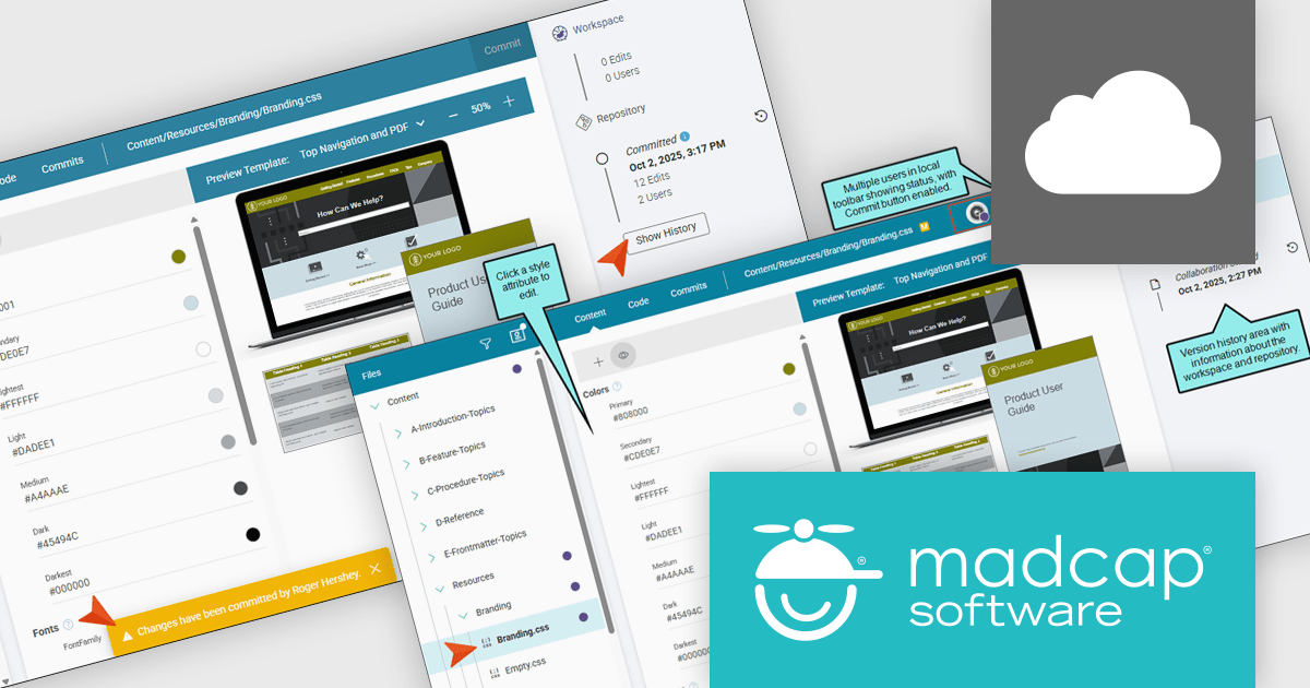 The MadCap Flare Online update introduces collaborative editing for the Branding Editor, enabling multiple developers and authors to work concurrently on shared branding assets such as logos, colors, and styles within a controlled workspace. By using a working copy of the branding CSS and committing changes back to the repository, teams reduce merge conflicts and accidental overwrites while maintaining a clear version history for auditing and rollback. This optimizes the process of updating UI styling across projects, improves coordination through status awareness and commit notifications, and helps ensure consistent, up-to-date branding without adding complexity to existing source control practices.
