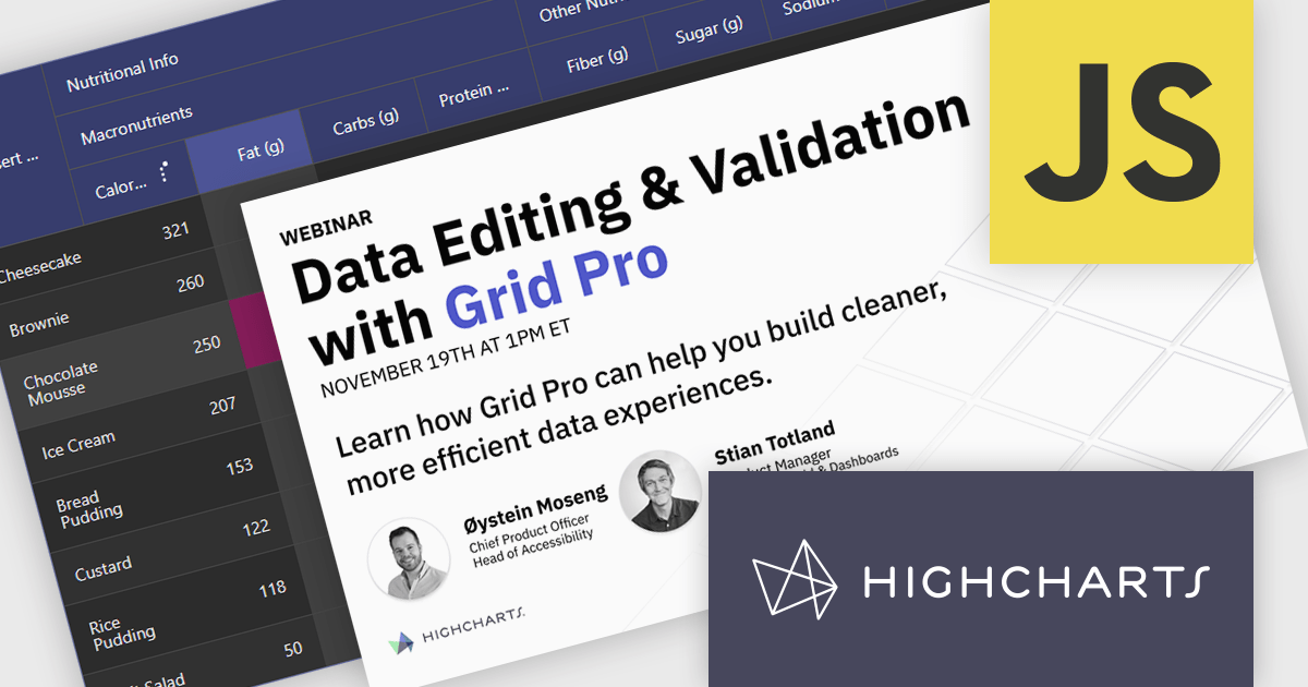On Wednesday, November 19th at 1:00 PM EST, Highcharts Chief Product Officer Øystein Moseng & Product Manager Stian Totland will be presenting a LIVE tutorial-stye and interactive walkthrough of Grid Pro, demonstrating how to edit and validate data seamlessly with Grid Pro's intuitive tools.