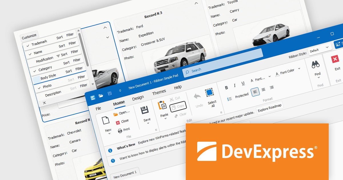 DevExpress UI components, frameworks and libraries help you build applications for Windows, web, mobile, and tablet. They provide everything you need to create high-impact business solutions including grids, spreadsheets, ribbons, charts, maps, gauges, reports, pivot tables, PDF viewers, and more.