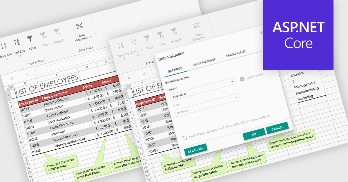 Several ASP .NET Core spreadsheet products offer data validation, including: